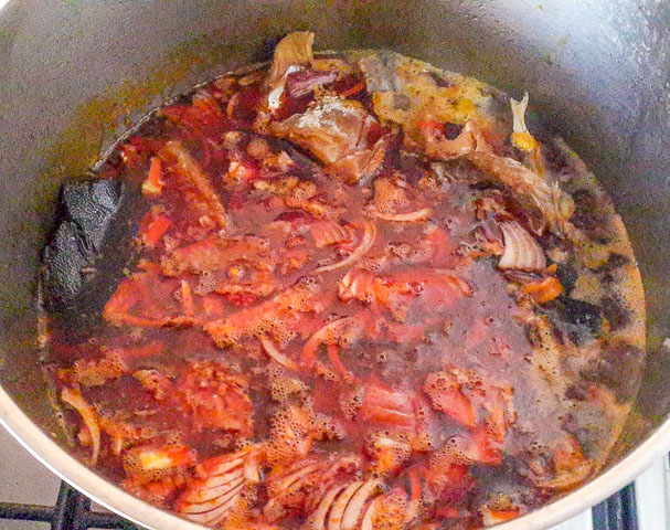 pot of meat, meat stock and oil in a pot for nigerian vegetable-soup